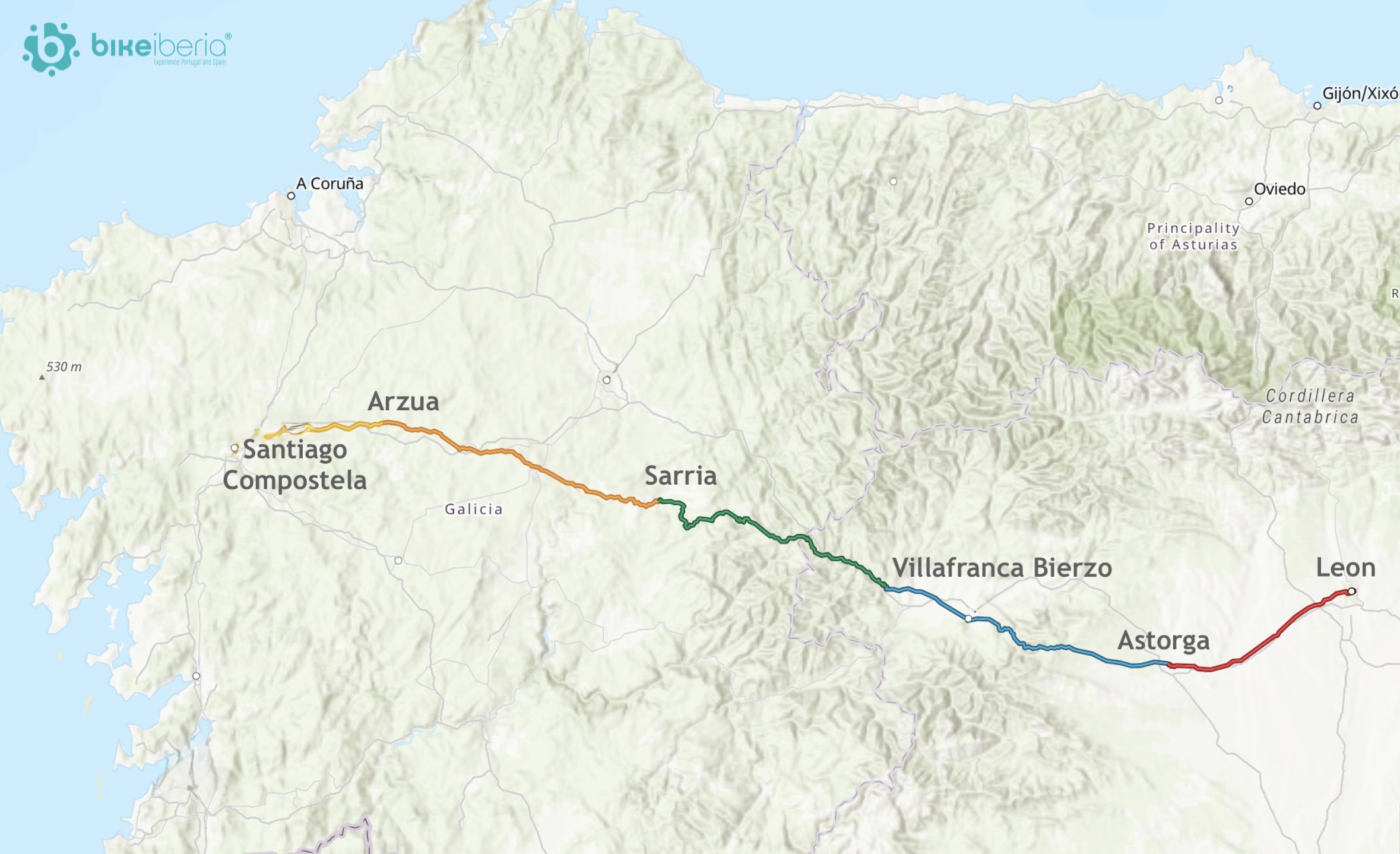 The undulating terrain takes you across forests and farmlands. From the a hilltop you will spot a large dam and then ride past the town of Portomarin on the banks of the Minho River. Continue on the ups and downs of Galicia until arriving in Arzua, the last major town of the Camino.